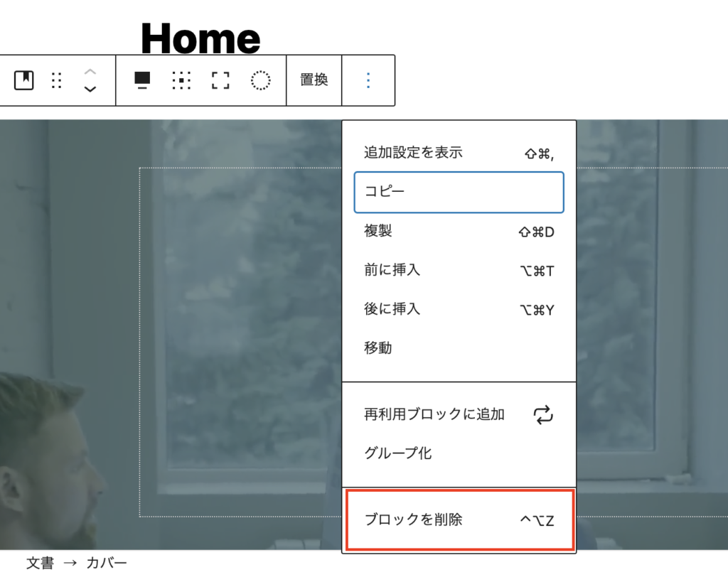 ファーストビューのカバーブロックを選択して「ブロックを削除」をクリックし、更新してください。